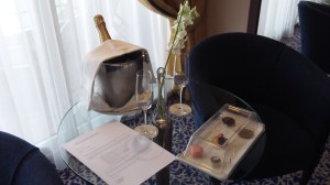 Thanks to a generous interline (travel industry) discount, we justified upgrading to a suite. While this is the size of your average hotel room, in cruise terms it’s quite roomy from all we’ve heard. Lots of people say you don’t need to splurge on a bigger stateroom on because you’ll have so much to do you’ll never be in there. I would tell those folks, if you had this cabin maybe you’d hang out there more. This is a 10-day cruise, in a new port every day, so we’re pacing ourselves and yes, enjoying our suite & its balcony during some down time. We left the balcony doors open last night & were lulled to sleep by the sound of the water & the cool ocean air.